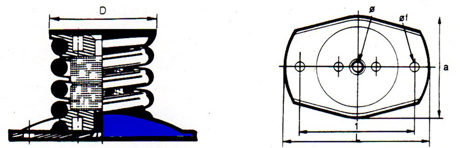 Amortiguadores para el montaje con aislación activa y pasiva. Esta gama de amortiguadores está constituida por una o dos suelas de acero según el tipo, por uno o varios resortes metálicos de alta resistencia, con 2 arandelas de unión de aleación ligera y un cojín metálico en hilo inoxidable en cada resorte. Todas las piezas de acero están protegidas por una capa de pintura.